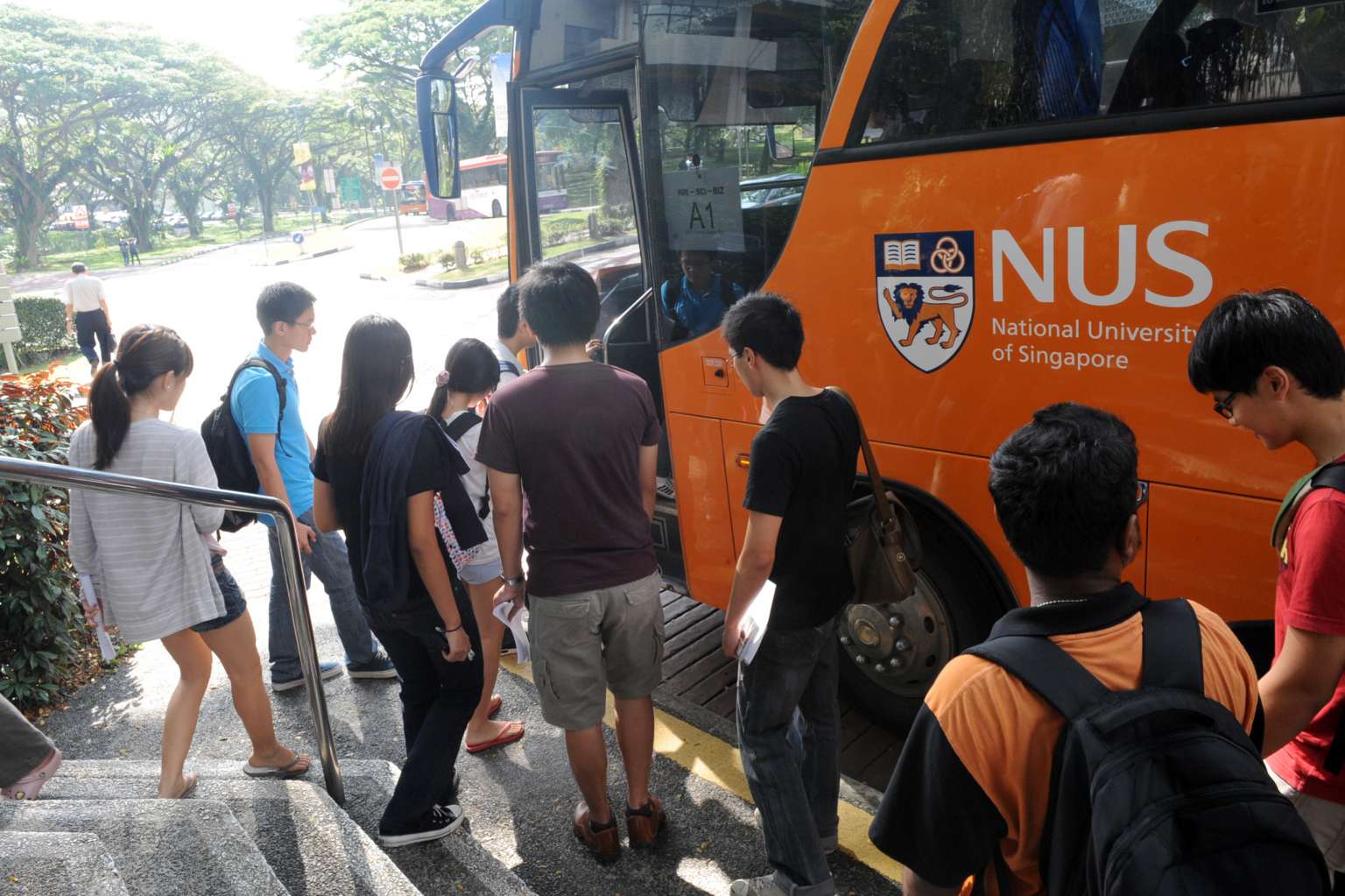 National University of Singapore (NUS) students boarding a bus.