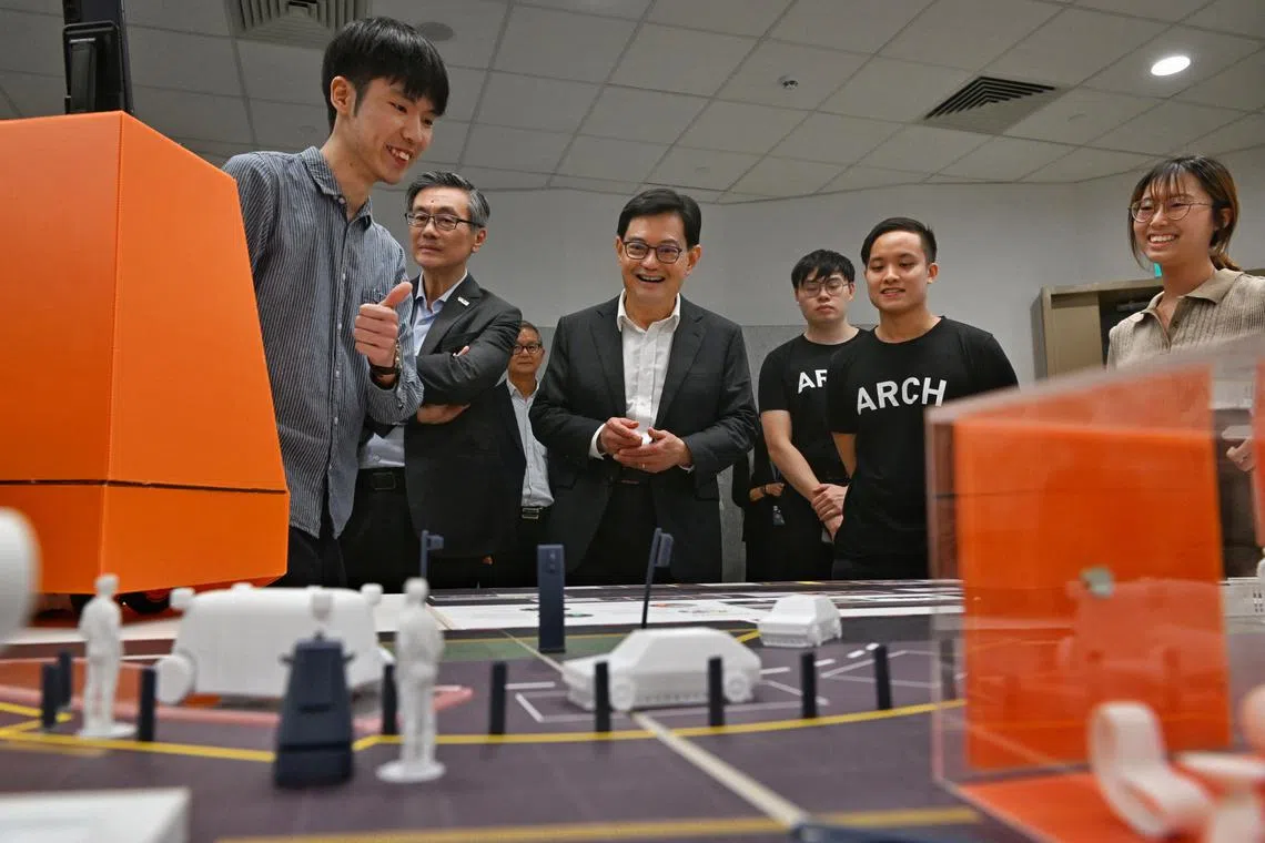 NUS president Tan Eng Chye (second from left) and DPM Heng Swee Keat (third from left) looking at students’ work during their tour of SDE3 at the university on Thursday.