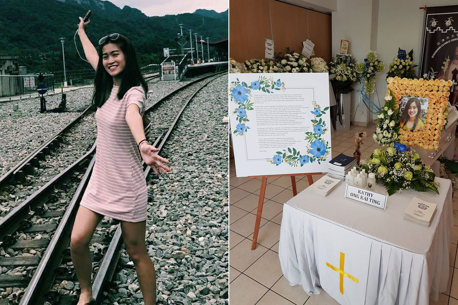 Miss Kathy Ong (left), who died in an accident on April 19, and a photo of her wake at the Church of St Teresa in Kampong Bahru, which was shared on Facebook by her father.
