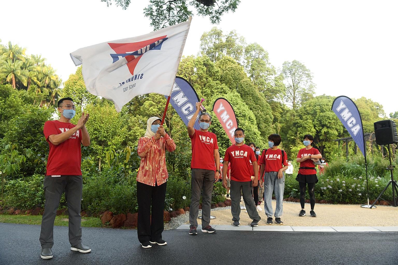 President Halimah Yacob flagging off the YMCA Special Needs Inclusive Challenge 2021 at the Istana yesterday. Eight participants with special needs will each attempt to scale the equivalent of Mount Fuji, which stands at 3,776m, by climbing hills and stairs around Singapore.