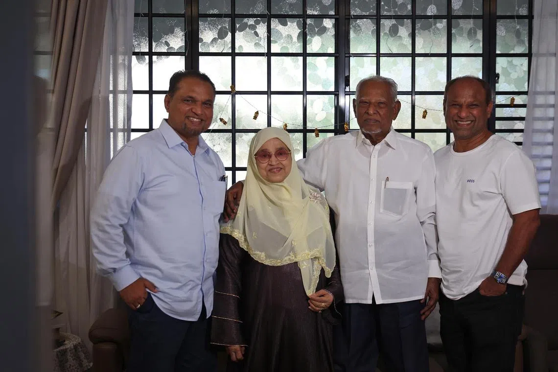 Mr Abdul with his wife, Madam Maharunnisabi, and their sons, PropNex associate branch director Mohamed Ali Gafoor (left) and PropNex co-founder and chief executive Ismail Gafoor.