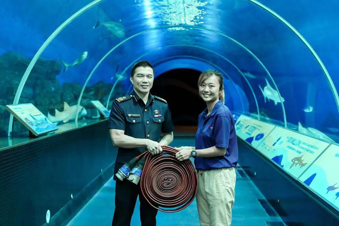 Assistant Commissioner Wesley Ho (left) and S.E.A. Aquarium’s animal care specialist Jane Neo with a donated firefighting hose.