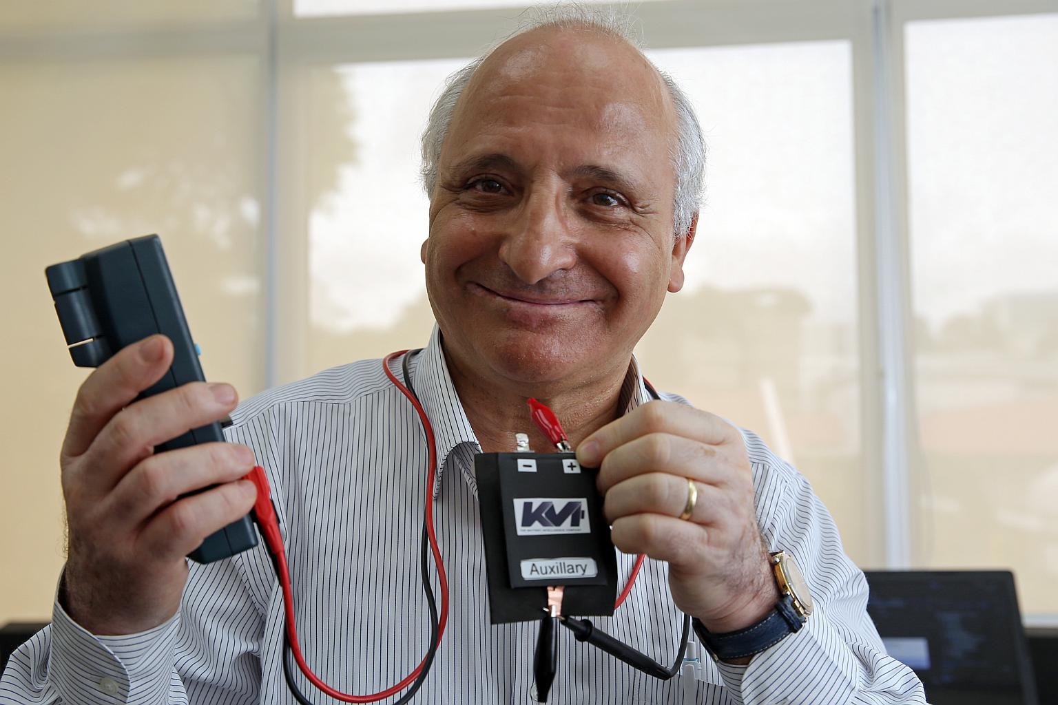 Professor Rachid Yazami with his prototype battery. The battery has a third electrode, which allows the draining of residual lithium-ions, which can restore the battery to 95 per cent its original capacity.