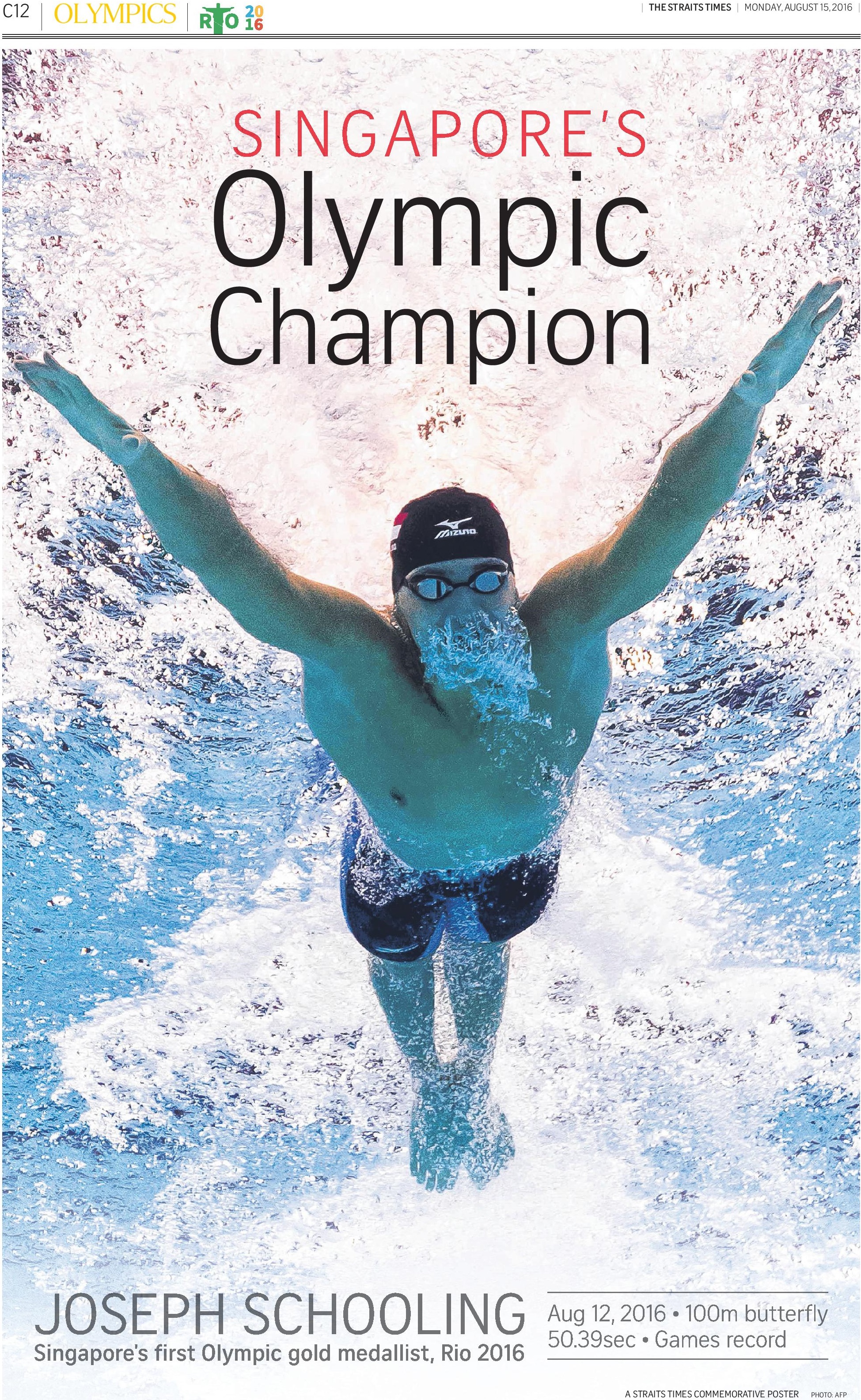 The Straits Times is including a two-page set of posters in its Aug 15 sports section to commemorate national swimmer Joseph Schooling's historic Olympic win.