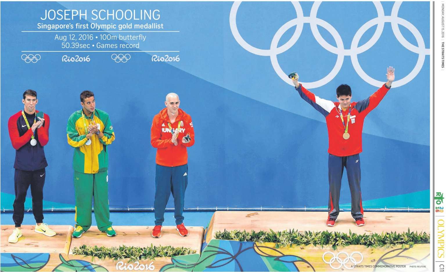 SINGAPORE - To commemorate national swimmer Joseph Schooling's historic Olympic win on Saturday (Aug 13), The Straits Times has included a two-page set of posters in its Aug 15 sports section.