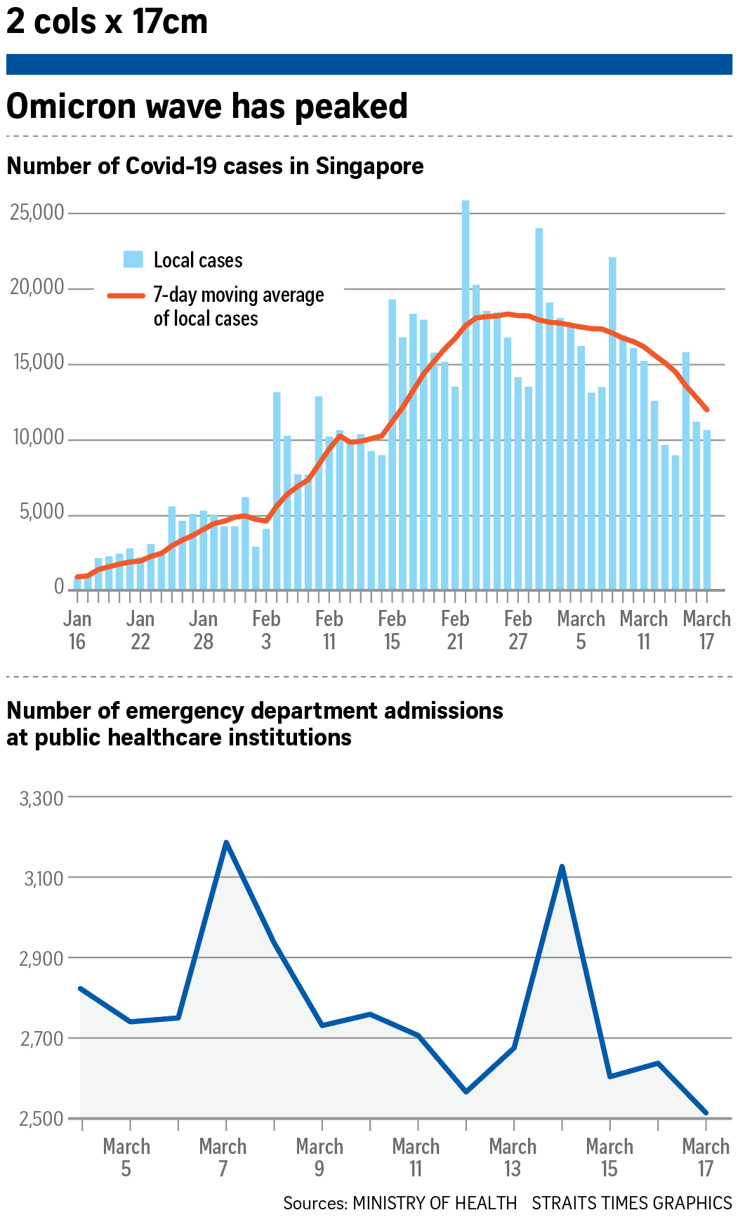 SINGAPORE - The peak of the Omicron wave is definitely over, but hospitals remain strapped largely due to non-Covid-19-related patients, said Health Minister Ong Ye Kung in a Facebook update on the local Covid-19 situation on Friday (March 18).