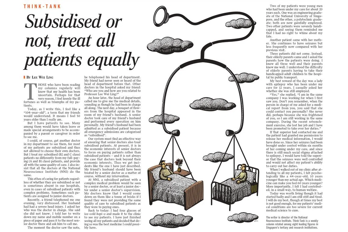 I also insist that all the doctors at the National Neuroscience Institute (NNI) do the same. This ethos of caring for patients regardless of whether they are subsidised or not is sometimes absent in our hospitals, even in cases of subsidised patients with complex problems. Sometimes such patients are assigned to junior doctors.