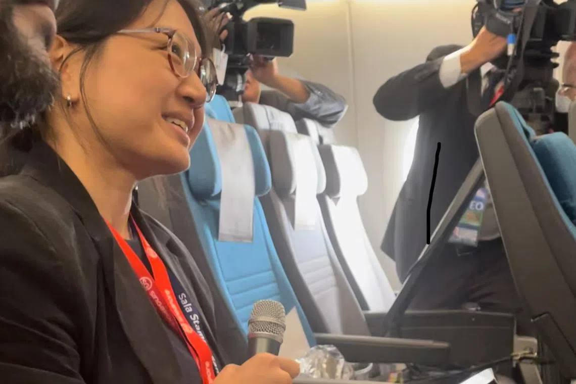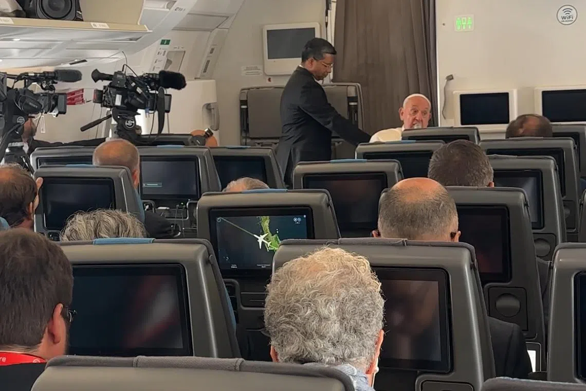 A few minutes earlier, the rear section of the plane was abuzz with activity as some among the approximately 80 Vatican-accredited media personnel rolled out wires across the floor of the Airbus A350-900 plane to catch a clean audio feed.