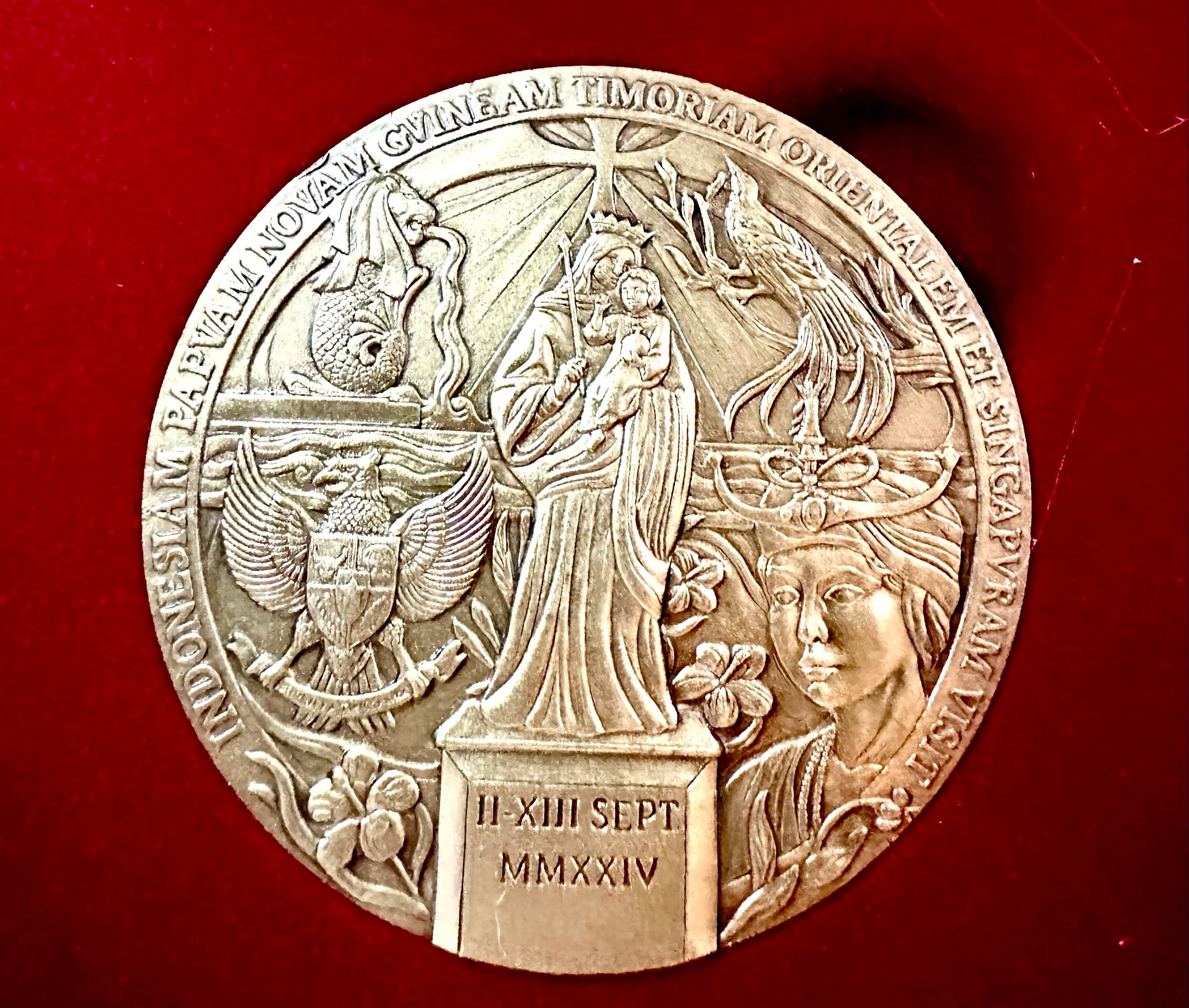Also among the gifts was a red box with a commemorative medal on which was engraved symbols of the four countries we visited together – Indonesia, Papua New Guinea, Timor-Leste and Singapore – surrounding the benevolent, crowned figure of a standing Virgin Mary holding in her arms Jesus with a globe in his left hand.