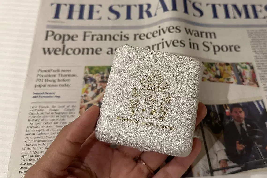 The package that came after the writer delivered a copy of The Straits Times to Pope Francis. It contains a rosary blessed by the pontiff.