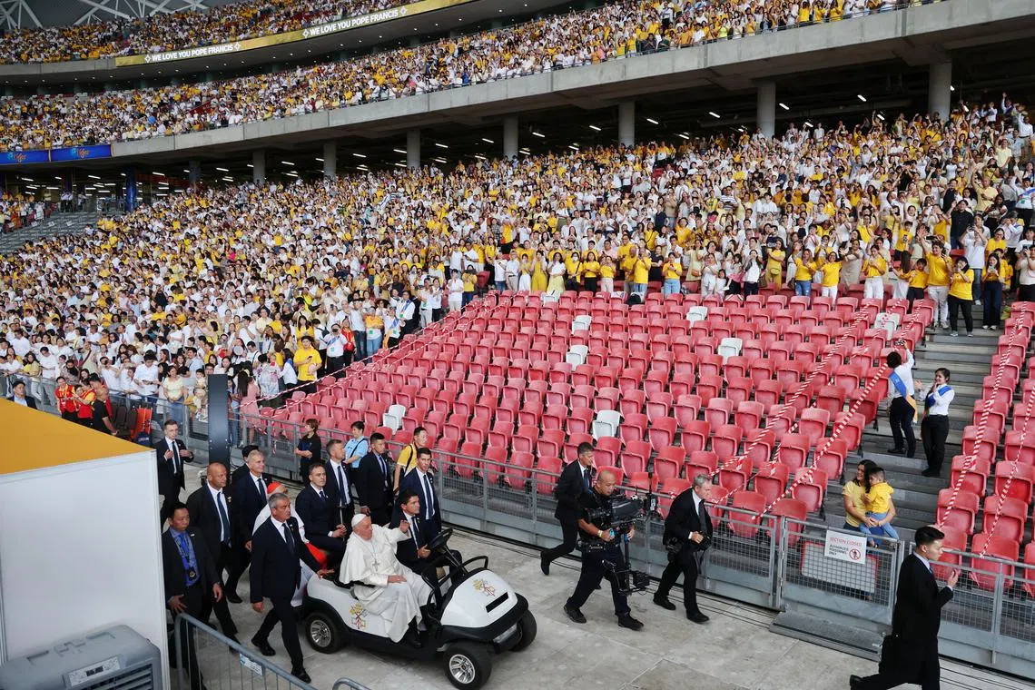 SINGAPORE – A crowd of some 50,000 people, from swaddled infants to white-haired seniors, welcomed Pope Francis to Singapore at the National Stadium on Sept 12.
