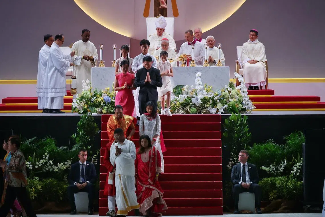In his homily, delivered in Italian with English subtitles shown on screens, Pope Francis commended the Catholic Church in Singapore as vibrant, growing and engaged in constructive dialogue with other religions.