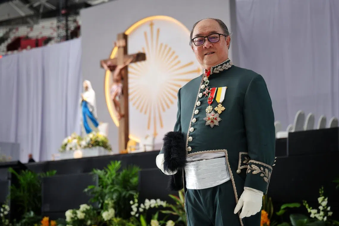 One member of the audience stood out in a feathered cap and green tailcoat. Sir Peter Low, Singapore’s only papal knight commander with star, was at the stadium with his wife and daughter.