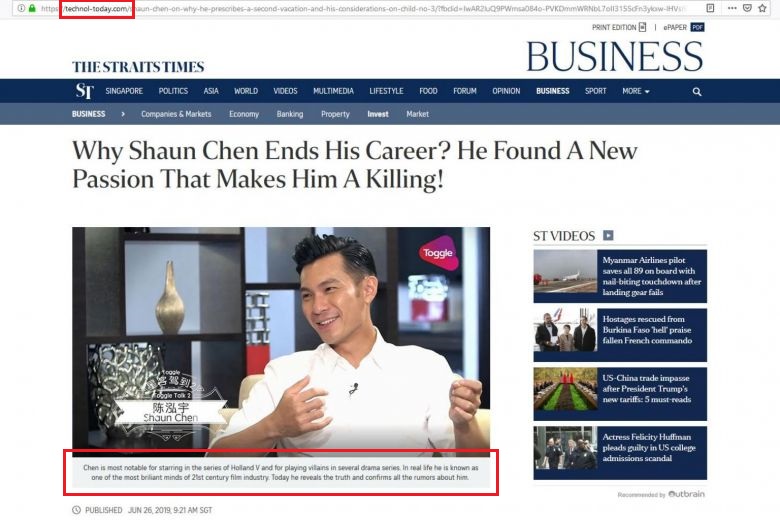 The page, which mirrors The Straits Times's website, displays a story about local TV actor Shaun Chen ending his career to focus on trading in digital currencies.