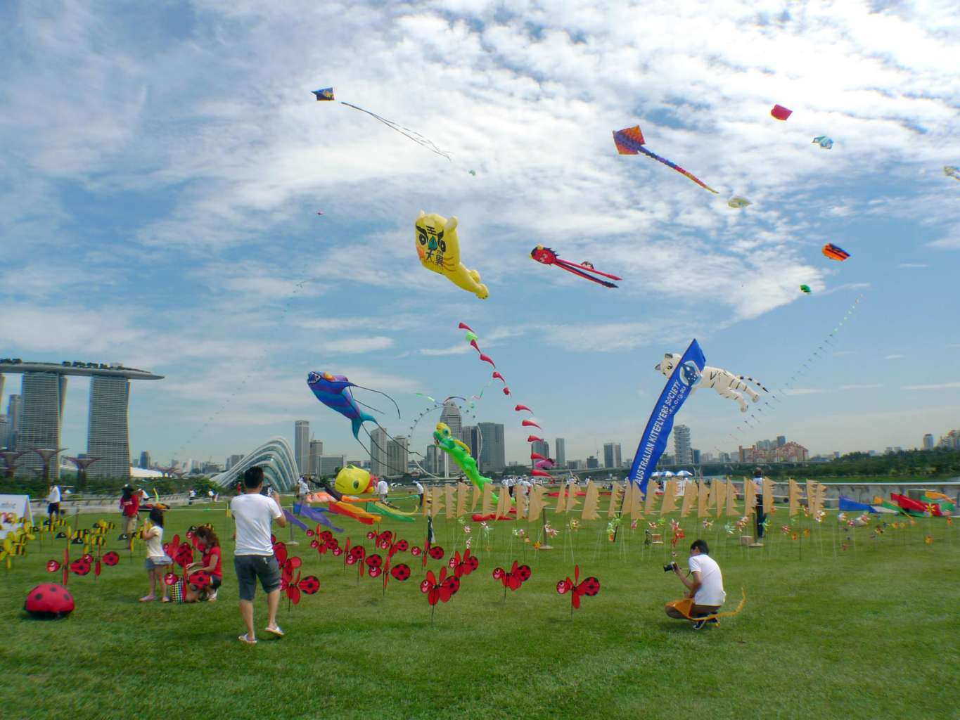 People flying kites at Marina Barrage.