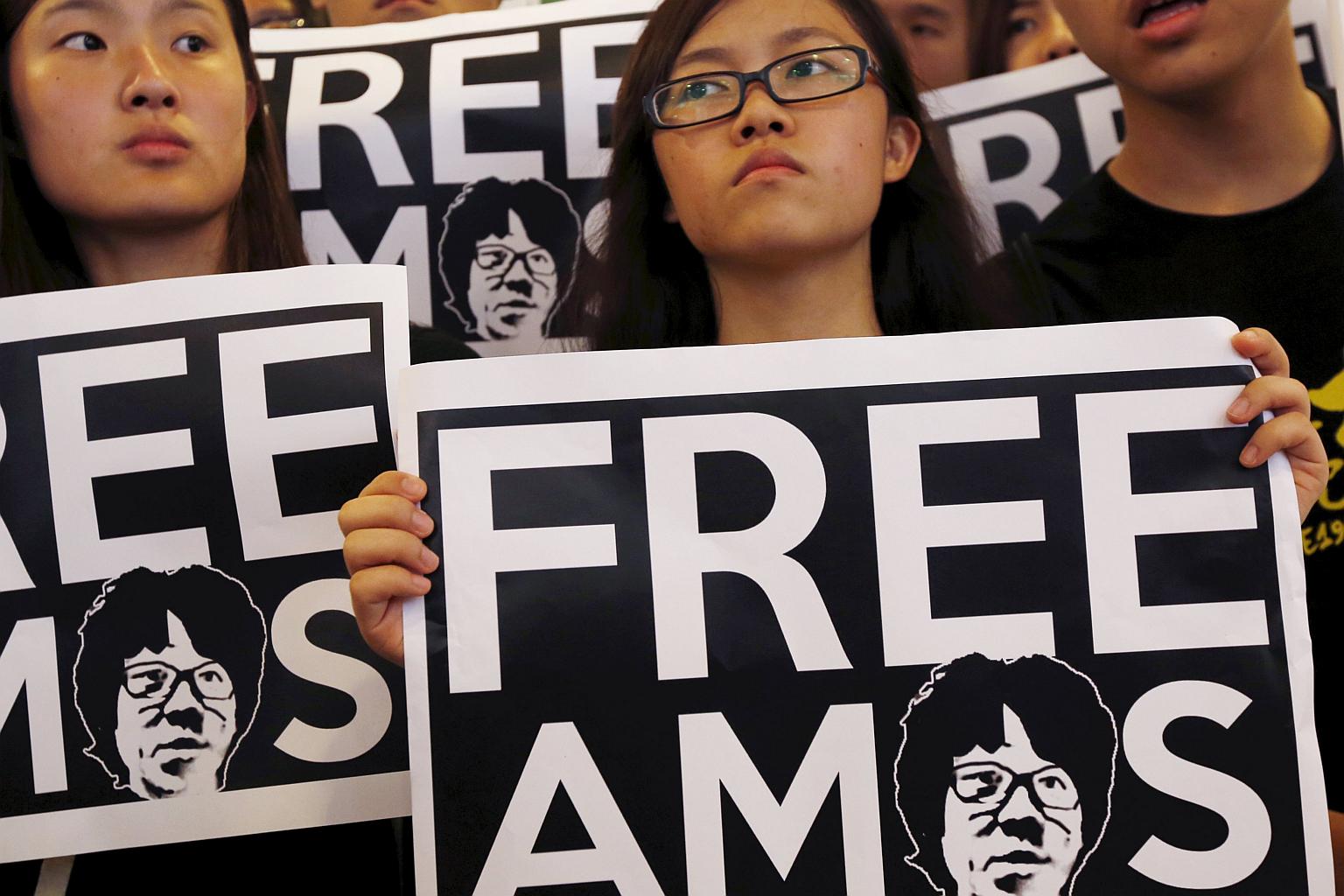 Students demanding the release of Singaporean teenager Amos Yee protest outside the Singapore Consulate in Hong Kong, China.