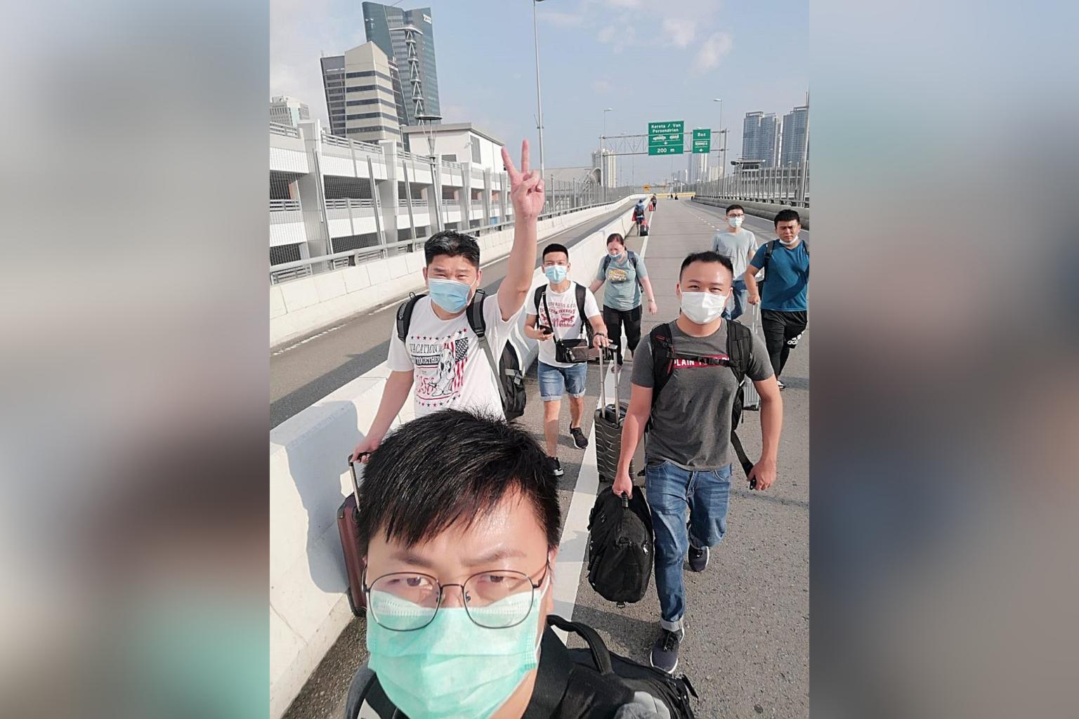 Some of the 10 Malaysian staff employed by Gain City walking across the Causeway last Monday when the border reopened. They are serving seven-day, stay-home notices and will start work if their swab test results come back negative.
