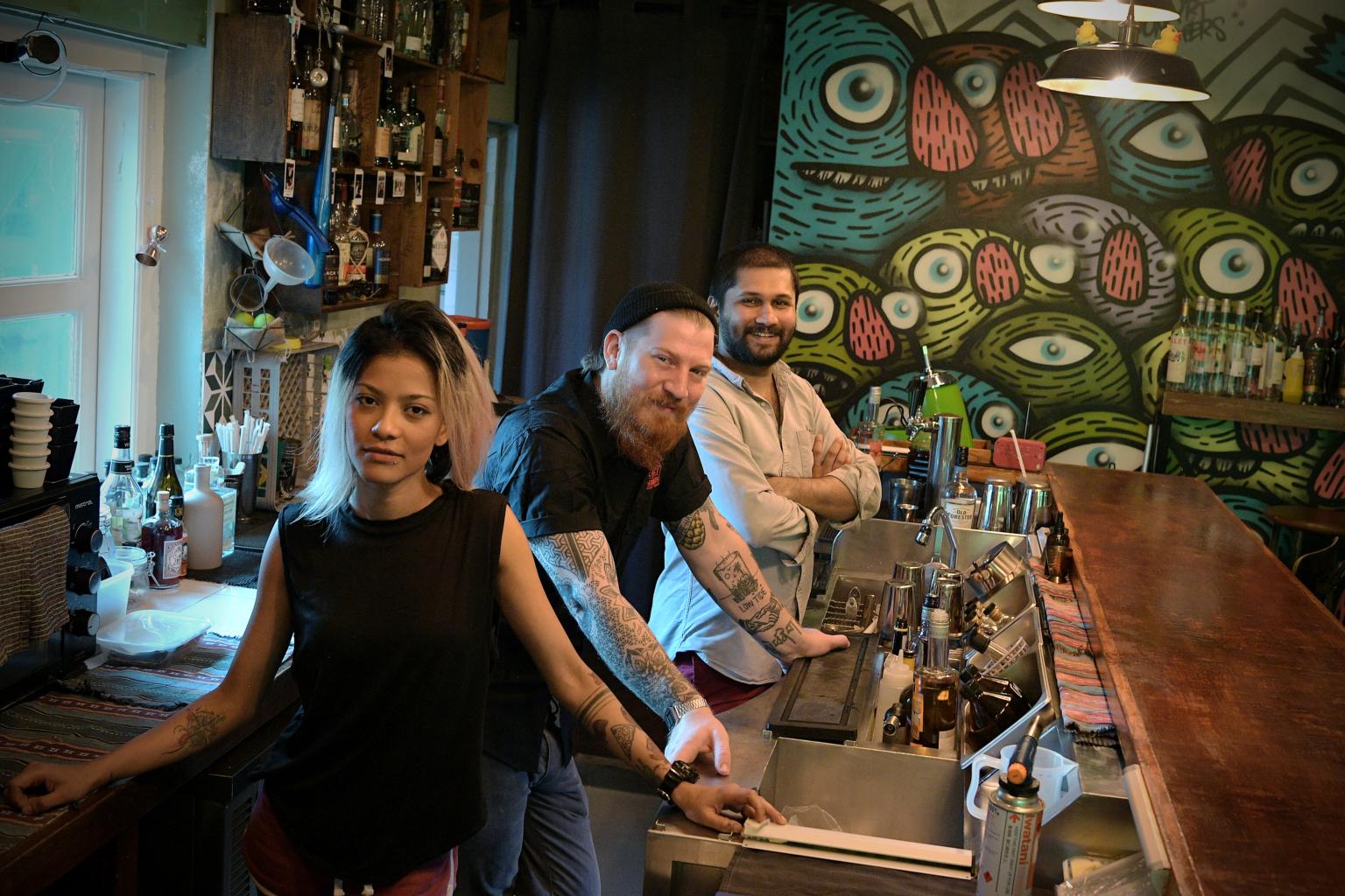 (From left) Entrepreneurs Desiree Jane Silva, Jay Gray and Abhishek Cherian George set up the Sago House cocktail bar in the midst of circuit breaker.