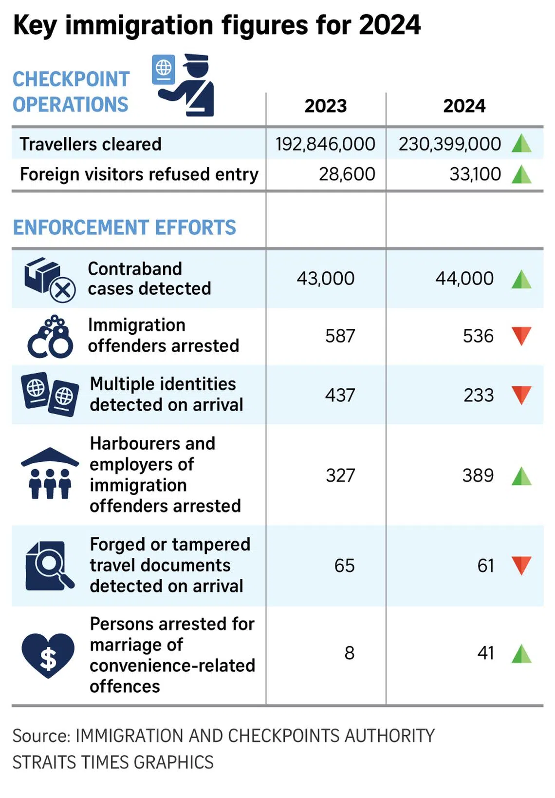 ICA’s statistics also showed that the number of immigration offenders arrested fell to 536 in 2024 from 587 in 2023.