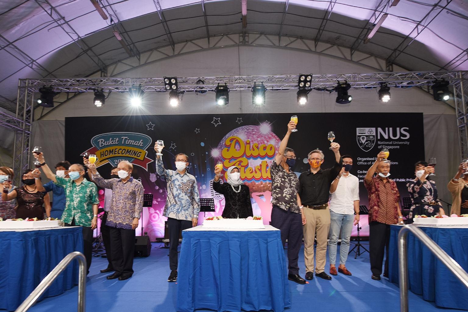 Among them was President Halimah Yacob, NUS' chancellor and law faculty alumna, who joined a cake-cutting ceremony and celebratory toast on stage.