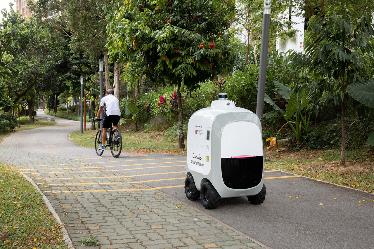An autonomous mobile robot on trial delivering parcels and groceries from neighbourhood mall Oasis Terraces to residential blocks in Punggol Woodcress.