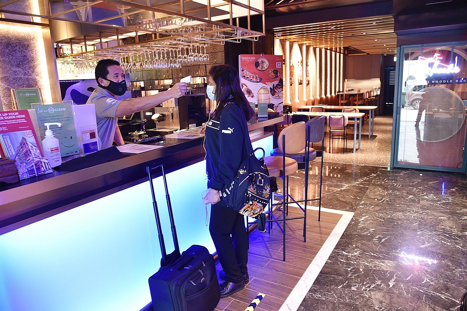 Hotel Soloha manager Raymond Howe checking the temperature of guest Karpagam M. Krishnaswamy yesterday. To be approved for staycations, hotels must adhere to practices like reducing capacity and intermingling, rigorous cleaning and disinfecting regimens, and screening guests before entry.