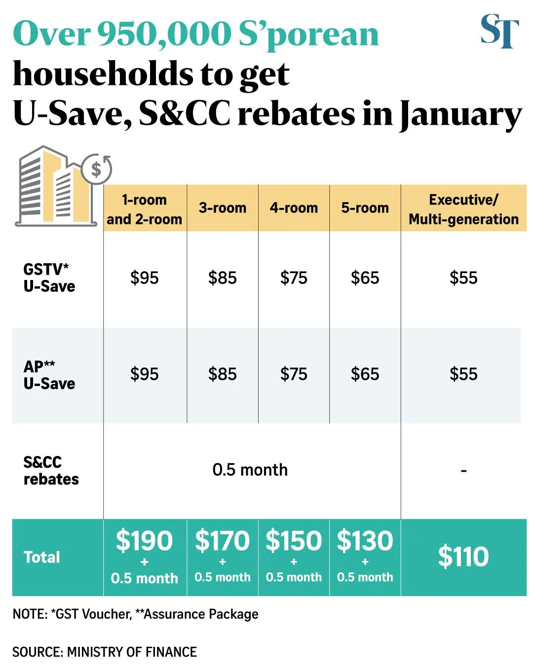 For example, people living in four-room flats will get $150 in rebates for their U-Save and half a month in rebates for their S&CC, while those in one- and two-room flats will get $190 for their U-Save and half a month for their S&CC.