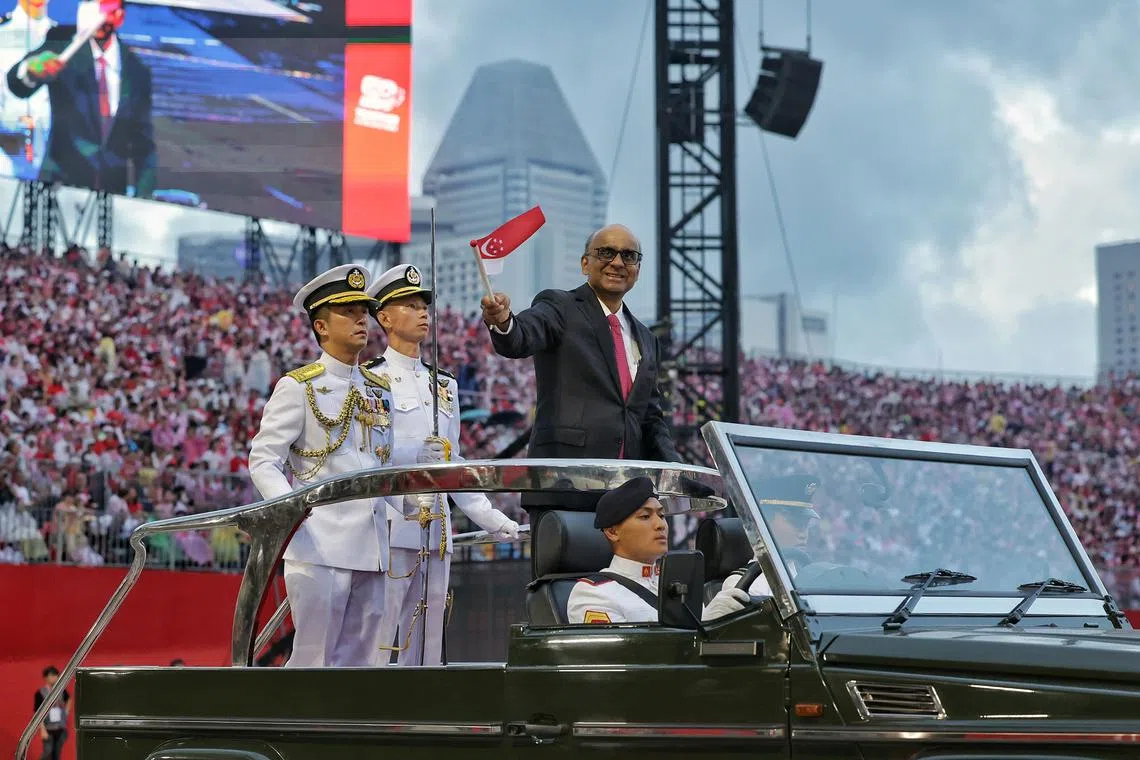 President Tharman Shanmugaratnam waving at spectators during the 2024 National Day Parade.