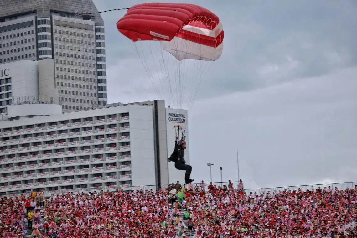 The Red Lions parachute team of the Singapore Armed Forces raised the ante when they descended from the sky, among them two female parachutists taking part for the first time in an NDP at the Padang.