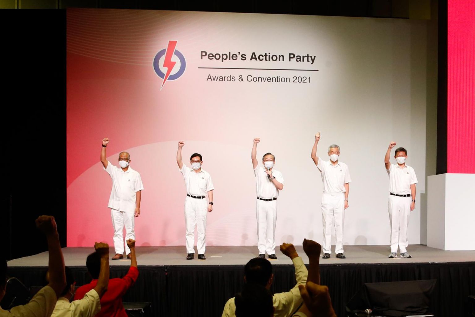 (From left) PAP vice-chairman Masagos Zulkifli, first assistant secretary-general Heng Swee Keat, chairman Gan Kim Yong, secretary-general Lee Hsien Loong and second assistant secretary-general Chan Chun Sing at the PAP Convention on Nov 28, 2021.