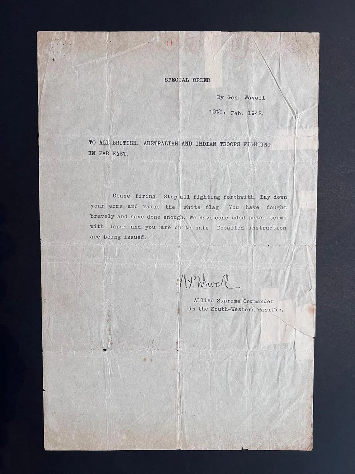A letter forged by the Japanese army, purporting to be from the Allied Supreme Commander in the South-west Pacific Area, instructs British troops to surrender. It was dropped over British troops in 1942, before the start of the Japanese Occupation.