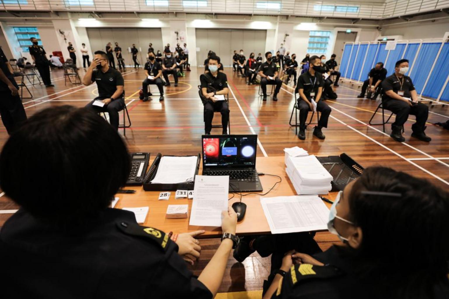 Home Team officers waiting during the vaccination exercise at the SCDF headquarters in Ubi on Jan 11, 2021.