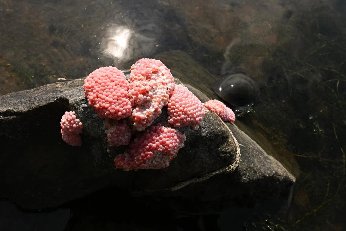 The snails’ bright pink eggs are often spotted on plants and structures emerging from the water surface, the PUB guide said.