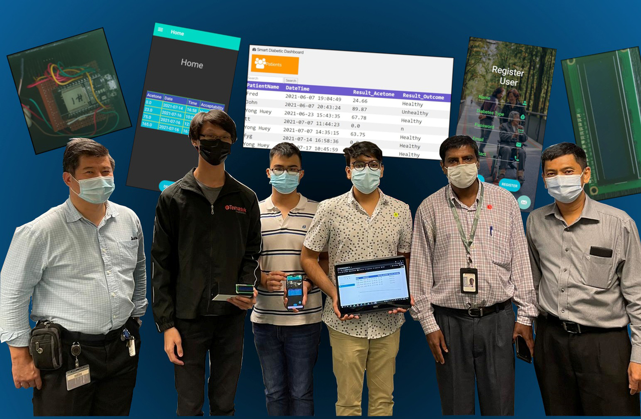 The Year 3 computer engineering students from Temasek Polytechnic developed a breathalyser which allows diabetics or those at risk of diabetes to measure their blood sugar levels by measuring the amount of acetone in their breath, cutting out the pain and discomfort of ritually pricking their fingers to draw blood.