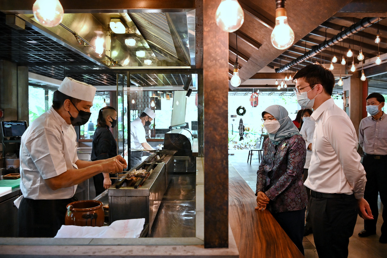 Madam Halimah on Thursday visited Japanese eatery ToriYard in Bishan Park, and spoke to management staff and workers, including young people on work-study diplomas from the Institute of Technical Education.