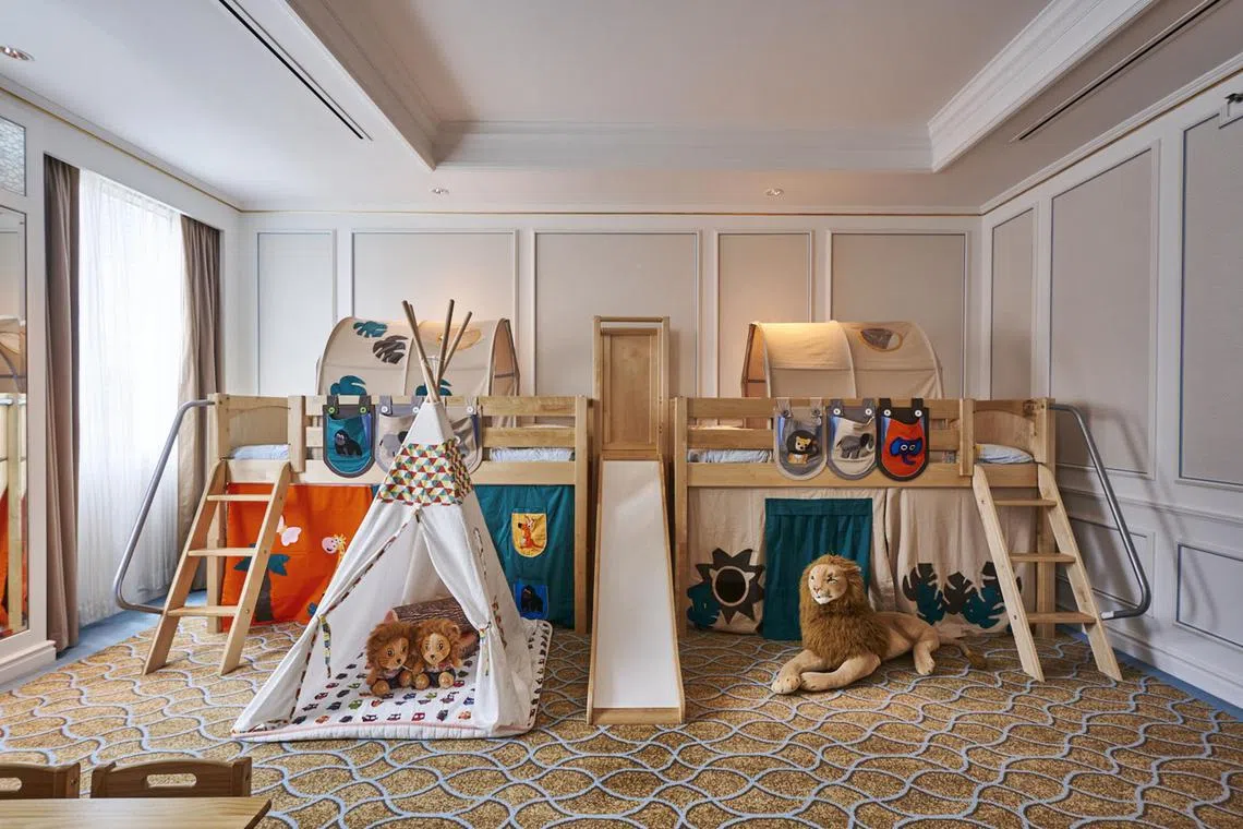 Two low loft beds with a slide are the star attraction at the Bugis hotel’s King Suite Kids Theme Room. It also has a teepee tent and animal plush toys for your kids to engage in imaginative play.