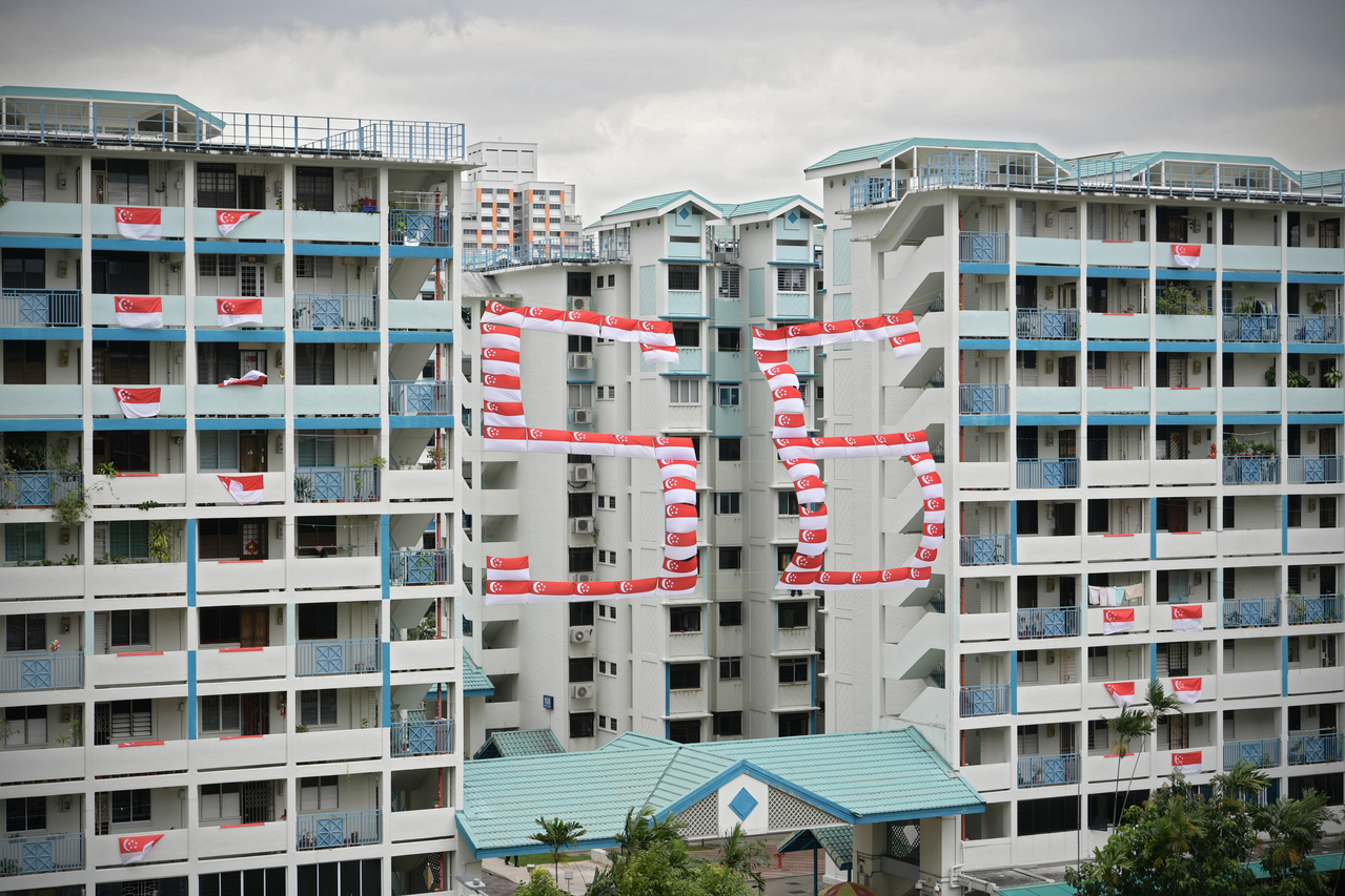 Flags forming the number "56" at Toa Payoh Lorong 1, near Braddell MRT.