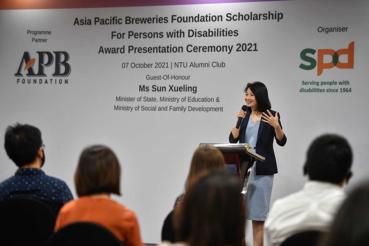 Ms Sun Xueling speaks at the APB Foundation Scholarship for Persons with Disabilities award ceremony on Oct 7, 2021.