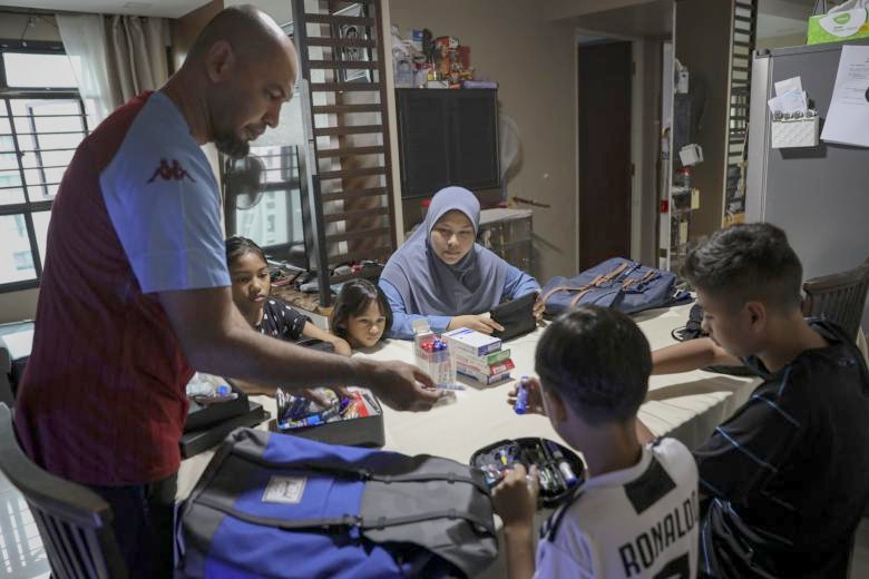 Engineer Bramsha Osman giving out the stationery that he bought for his five children ahead of the start of the new school year.