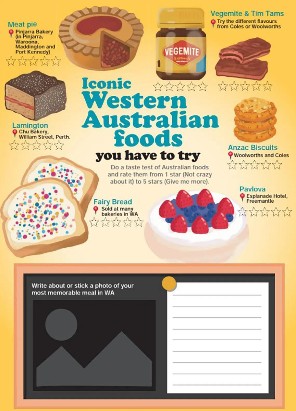 For example, children are encouraged to do a taste test and rate popular Australia food, such as the Tim Tam chocolate biscuit, lamington cake and Vegemite spread.