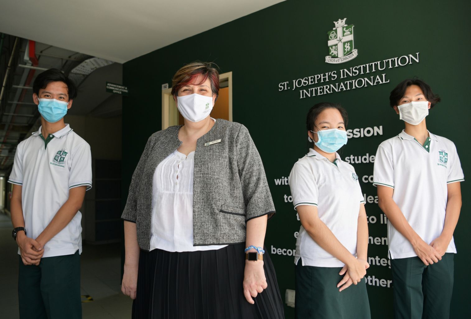 Ms Maria Ciola, director of advancement, communications and admissions at St Joseph’s Institution International High School, with students on scholarship at the school.