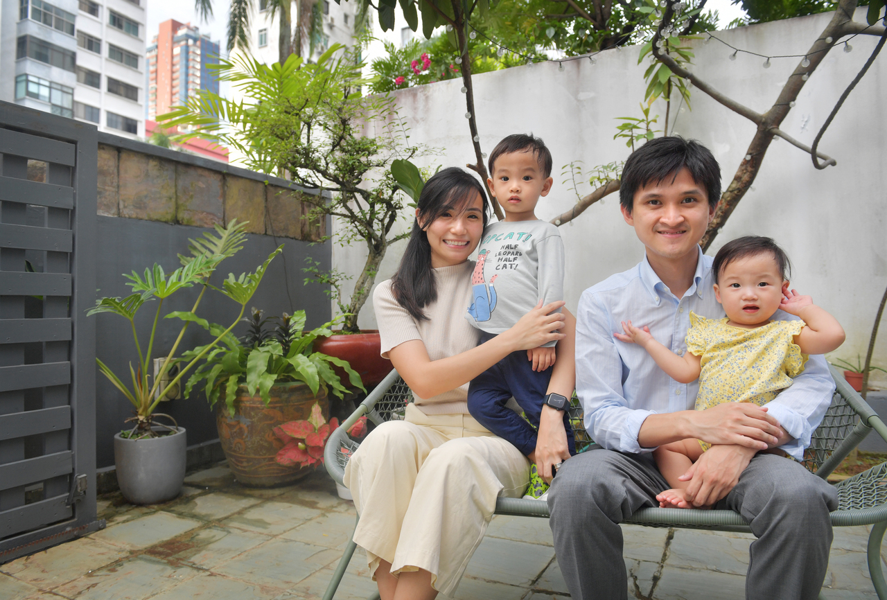 Ms Amanda Ong, founder of the Aunty babysitting app, with her husband Randy Cheung and children Andrew and Claire.
