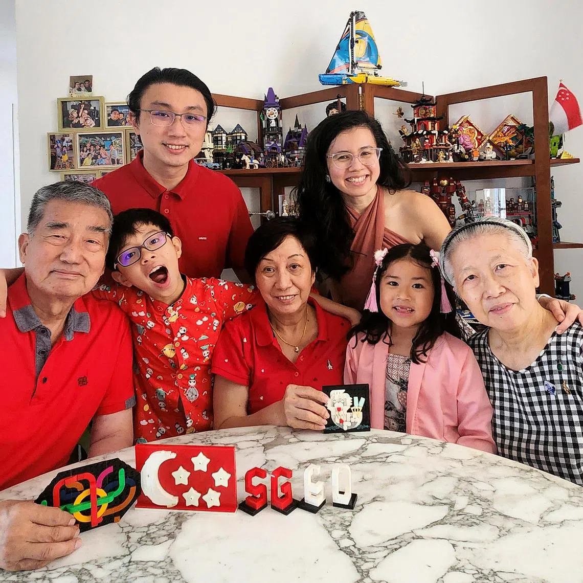 Siblings Eli and Eva Lim interviewed their paternal grandfather Lim Seow Beng (far left) and maternal grandmother Maureen Pang (far right) about their lives during Singapore’s early nation-building years. They are seen here with other family members.