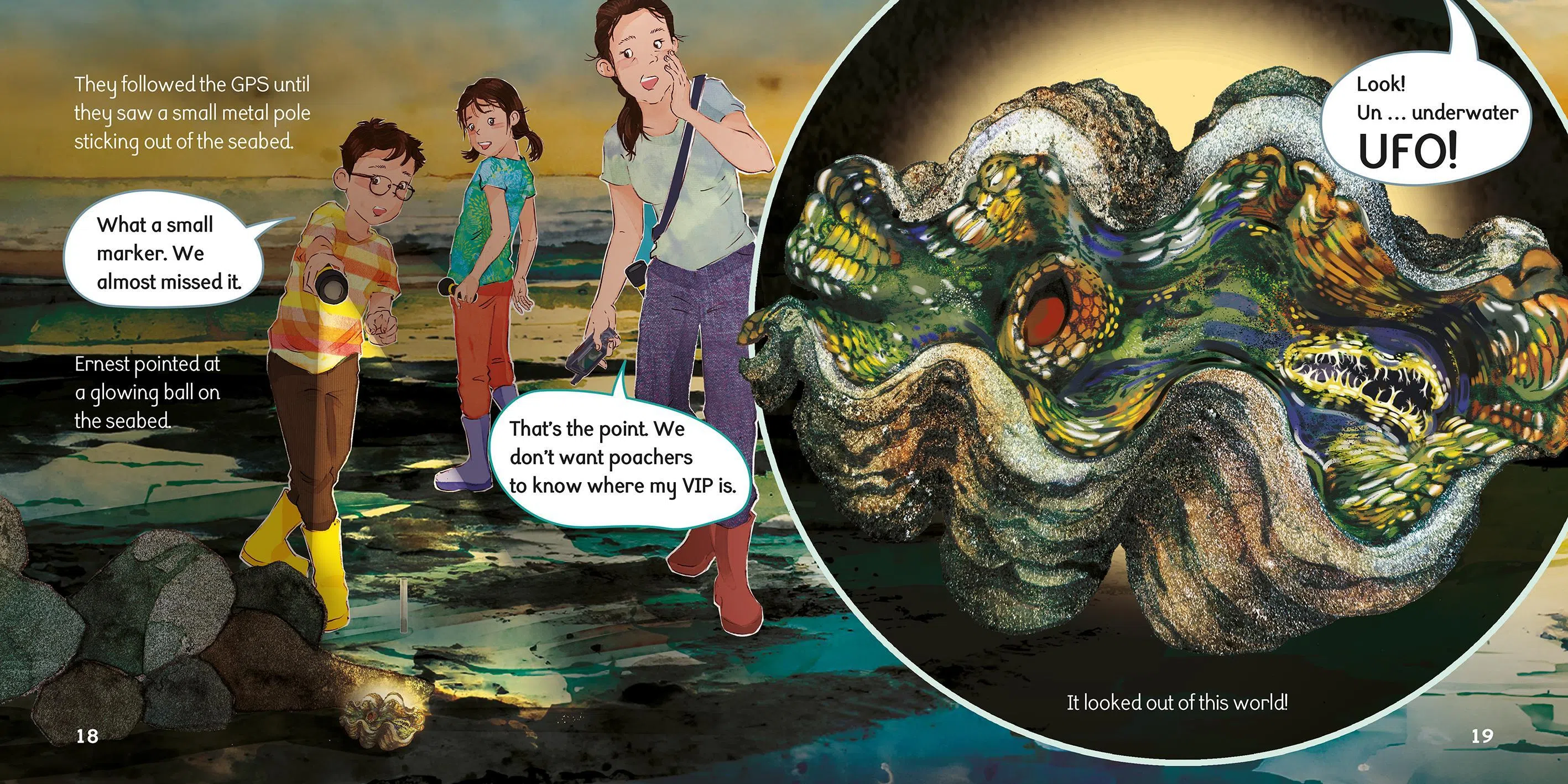 Picture book Giant Clam Calamity follows two classmates who join a marine scientist on an intertidal walk along Lazarus Island.