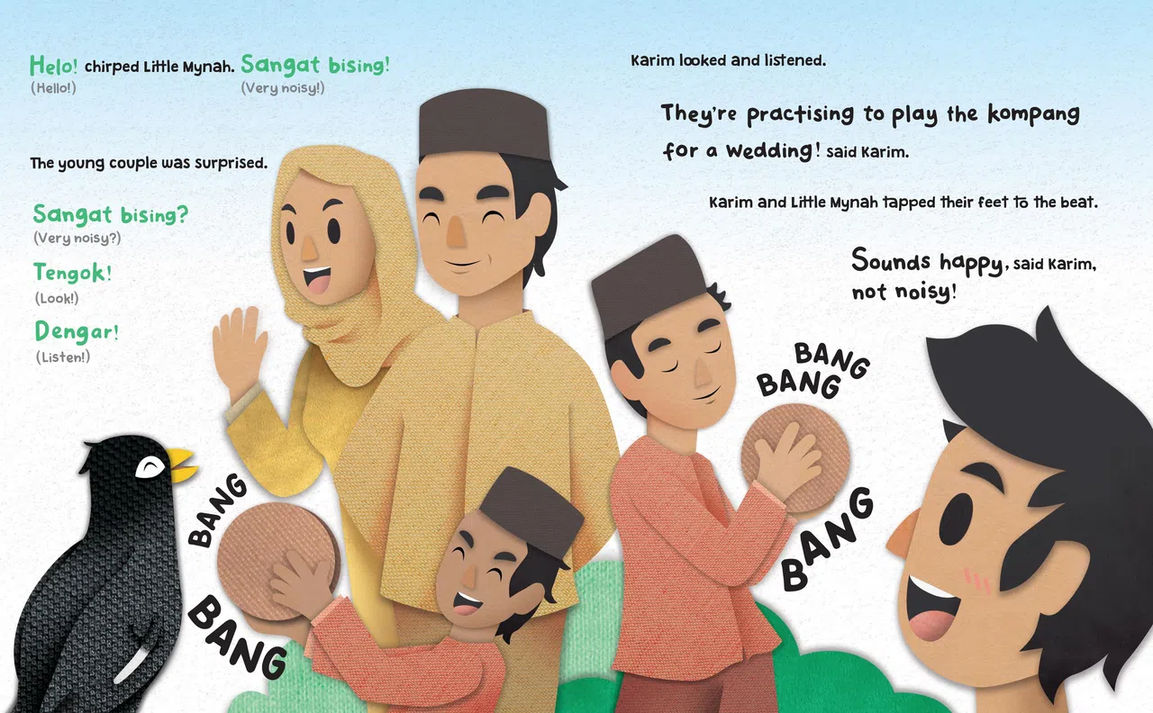 Evelyn Sue Wong's Just A Little Mynah multilingual picture book series with illustrator Dhanendra Poedjono has text in in English, Chinese, Malay and Tamil.