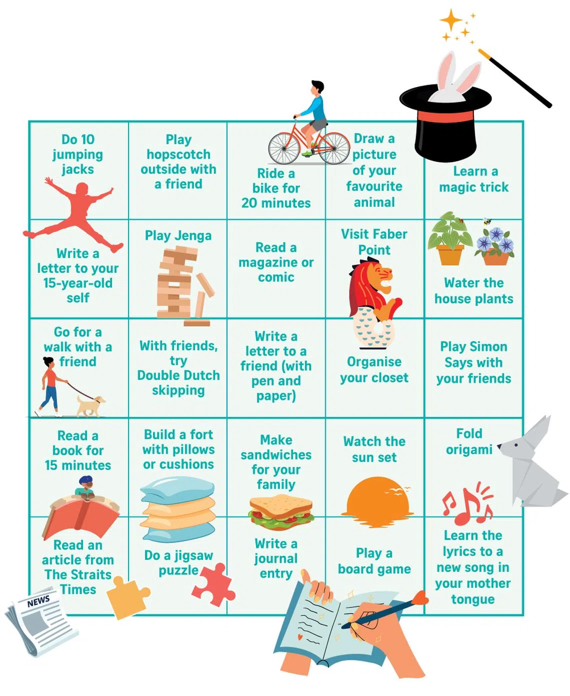 Complete one activity and mark out that square by drawing a cross on it. Keep going until you complete five activities in a row, either horizontally, vertically or diagonally. Once you have completed a row, take a photo of your completed card and send it to stdot@sph.com.sg