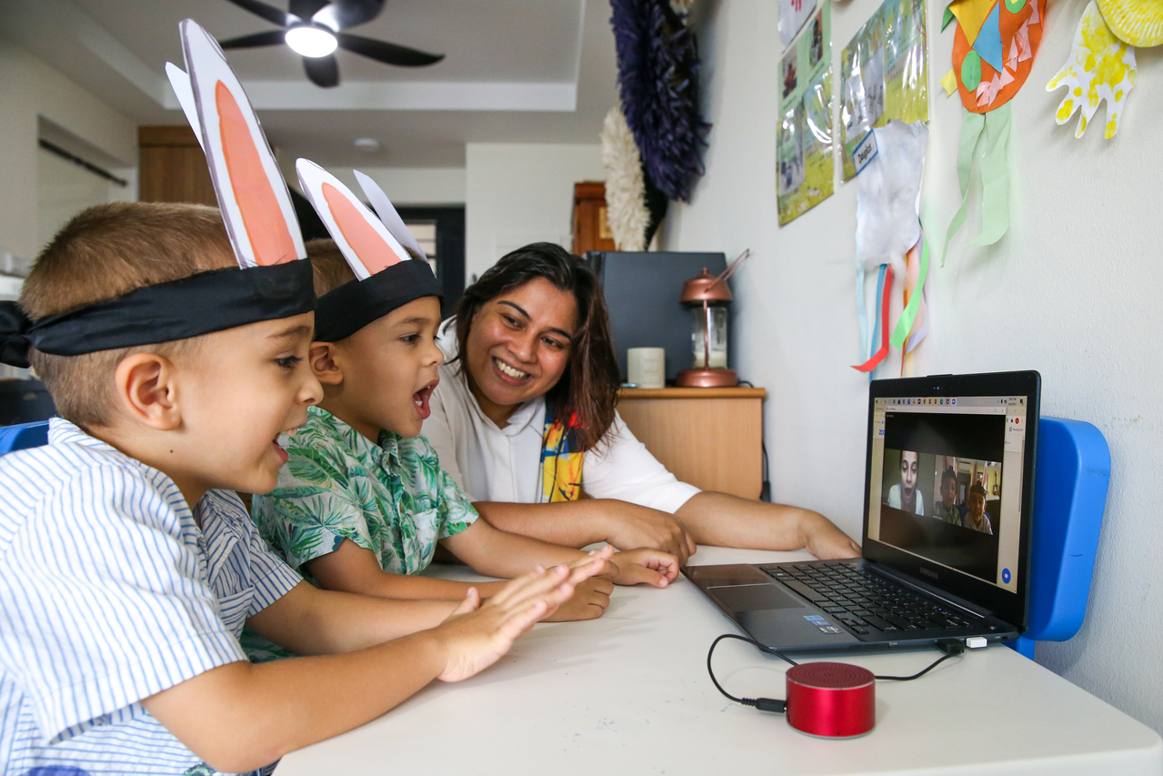 (From left) Douglas and Duncan Cain and their mother, Mrs Veronica Cain, starting a Zoom call with Ms Selma Alkaff, who presented an Easter-themed storytelling session that included a scavenger hunt for the children.