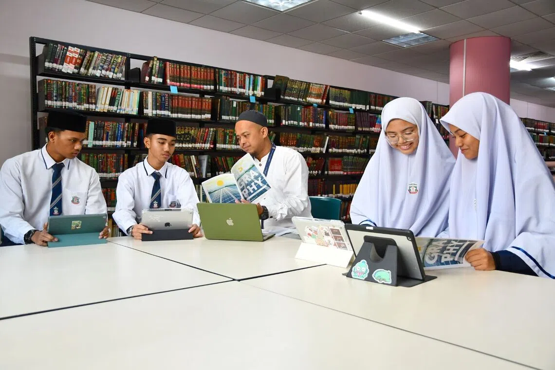 Mr Mohammad Fauzi Azman (centre) guides students at Madrasah Aljunied Al-Islamiah using both print and digital learning materials.