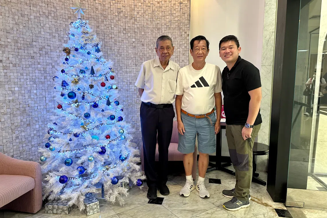Mr Chua with his former discipline master Mr Wambeck (left) and geography teacher Mr Kaan (centre) from his secondary school who had inspired him to persevere in life.