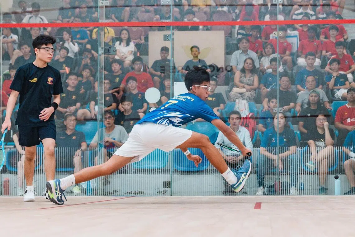 Richard (right) playing against Ethan Tan from Anglo-Chinese School (Independent) during the National School Games B Division squash finals on April 30.